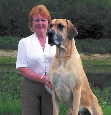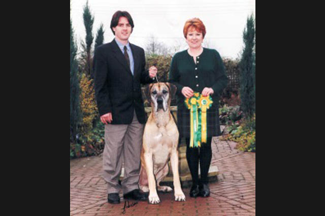 In 1983 we bought in from the late Joy Butcher’s Daneton kennel a fawn puppy bitch, Louisiana. We enjoyed more success with her and despite her maturing late she really did blossom into a wonderful specimen. Equally she was, despite many failed attempts, to later provide us with our first home bred Champion. We were really excited about the quality of the Danes at the Walkmyll kennel and with several failed attempts to produce puppies we purchased Flare from Ron and Freda Lewis.