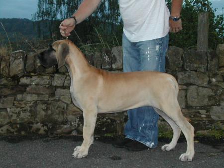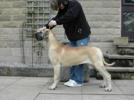 We are so proud of our beautiful bitch Echo, who was bred in the purple from two wonderful owner bred parents. A qualifier for the prestigious Petplan Junior Bitch Stakes (All Breeds) at the age of fourteen months she can be seen in her photo\\\'s competing (moving action shot!) at the Grand Final, aged eighteen months (the only Working Group dog to qualify!). Echo enjoyed a successful puppy career (Runner Up in the Dog World/Pro Plan Puppy Stakes competiton at Manchester), a sparkling Junior campaign gaining her Junior Warrant along the way before finishing with a RCC! Out of Junior and into Yearling she gained her 2nd RCC and continued to win Limit classes picking up her third RCC! You can see from the various photo\\\'s in her gallery how this beautiful animal has grown up and rest assured she has the personality to match!\\r\\nWe made a very concious decision to withdraw Echo from her campaign and have a litter, choosing the stylish Brindle male, bred in Norway and residing in Denmark - Highesteem Keep \\\'Em Talking. This combination produced twelve puppies and whilst the birth was traumatic, Echo suffered a ruptured uterus and is now speyed, she was the role model mother and loved her babies throughout. You can find her progeny elsewhere on the site. \\r\\nIt is fair to say that Echo loves life and we love her to bits, she is a real treasure to live with.