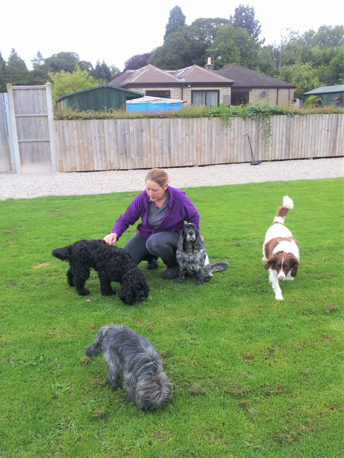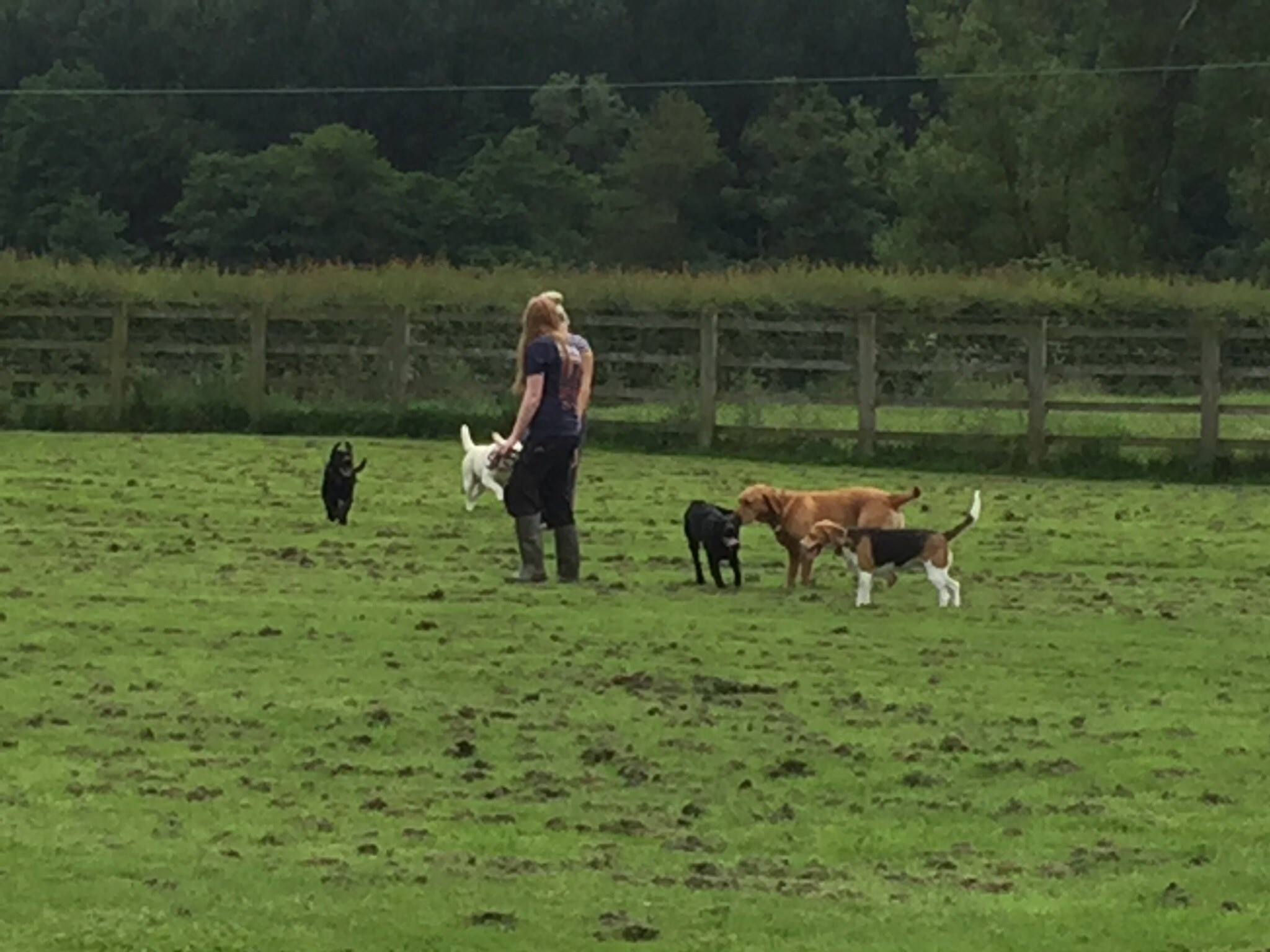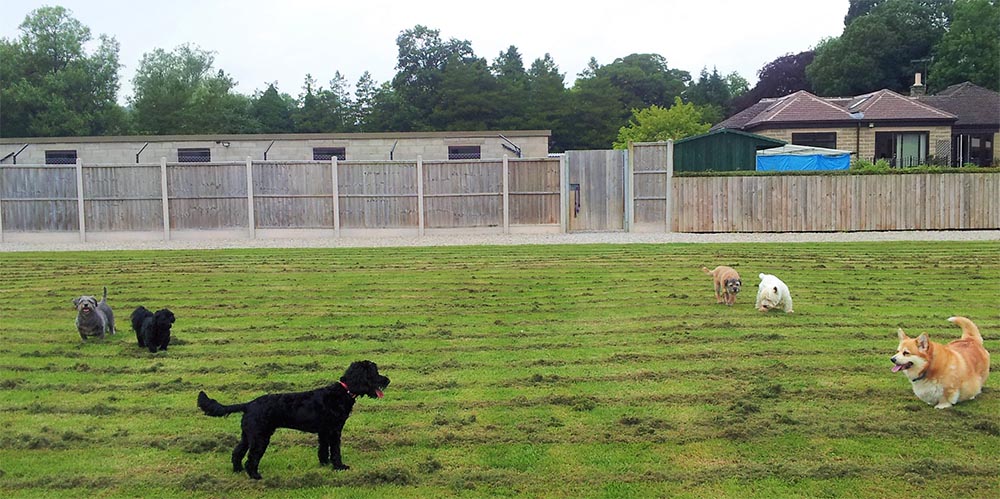 A. The boarding dogs are exercised twice daily. In the morning in an enclosed all weather surface compound whilst their kennel, run and bedding is checked and cleaned. After lunch in our paddock. Either free running with several other dogs, individually free or on a Flexilead. This is playtime too with footballs, Kongs, Frisbee's etc. The type of exercise depends upon the dogs sociability and obedience in returning to one of the staff. All exercise is of course supervised by one or two of our excellent staff.