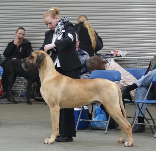 After the Christmas and New Year festivities we looked forward to getting the first show under our belt. We had success in the AVNSC classes last year with our Danes and this year, for the first time, the society had scheduled specific breed classes and a breed judge, Charles Brooks. Selmlada I Am Rock J.W. did not like the Astroturf surface and was third in his first Open dog class, Selmalda Glory Days was second in Post Graduate and Selmalda Rock Ola Baby J.W. topped Open Bitch, won Best Bitch and BOS! Great start to 2011 for Ola Baby!