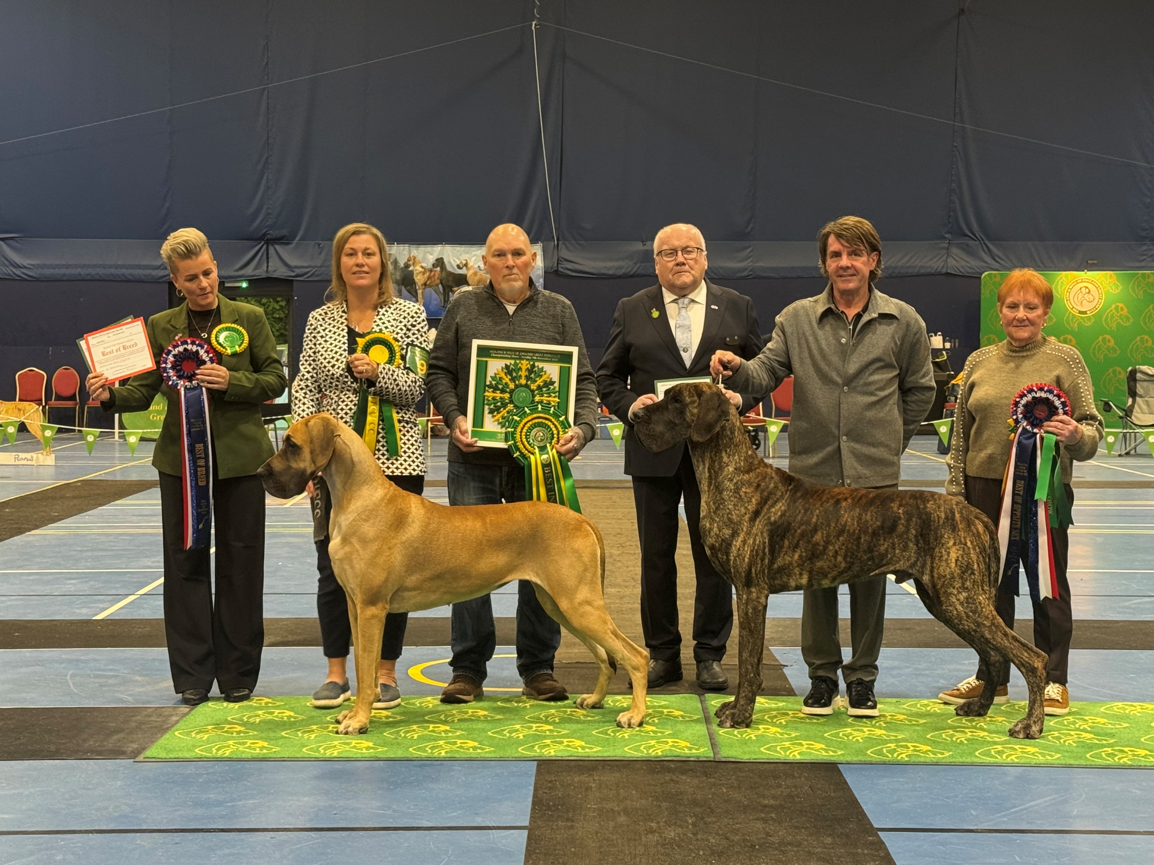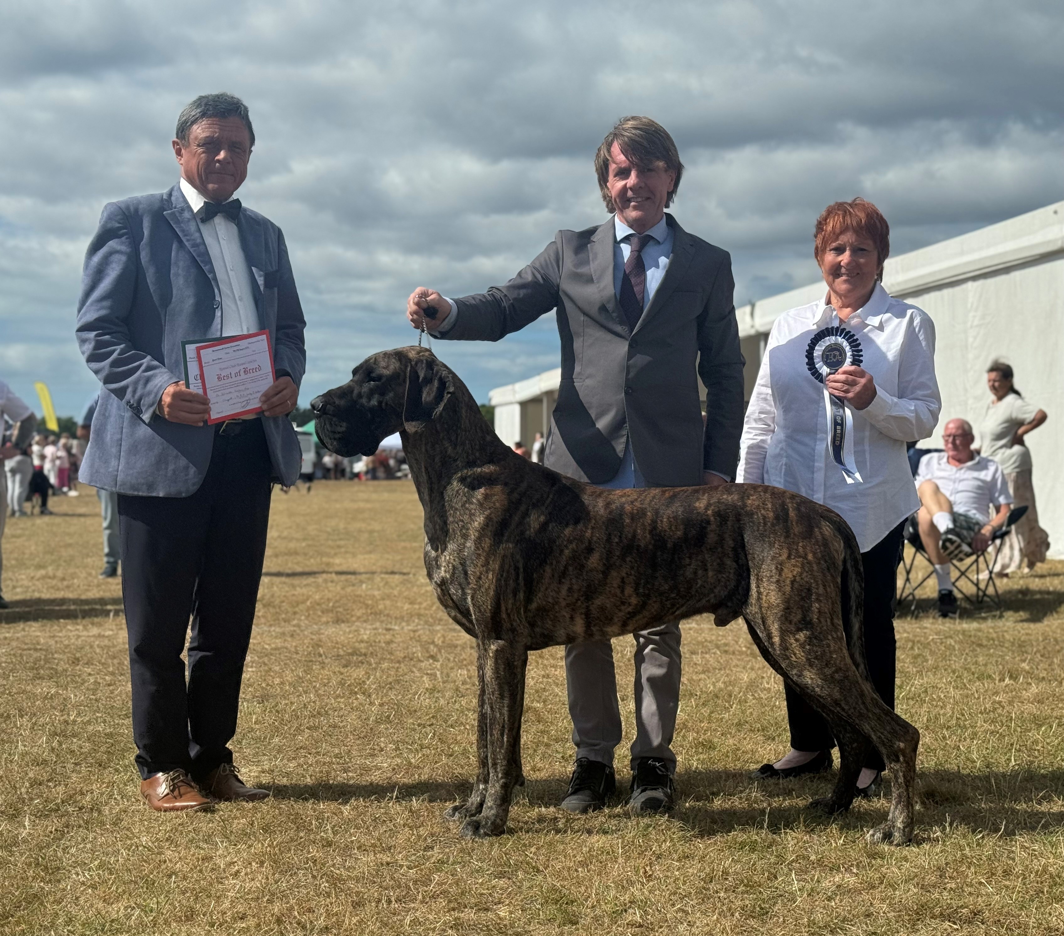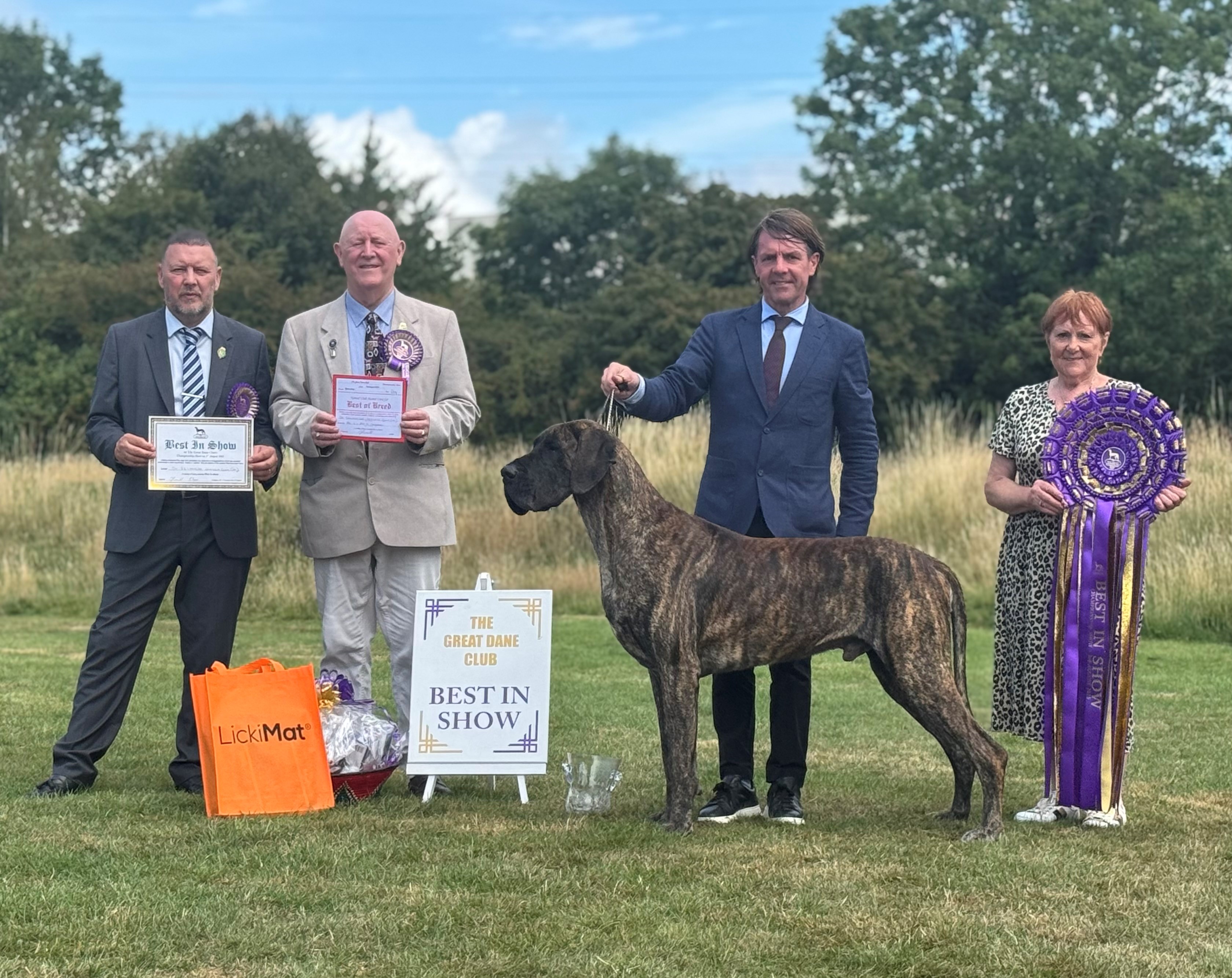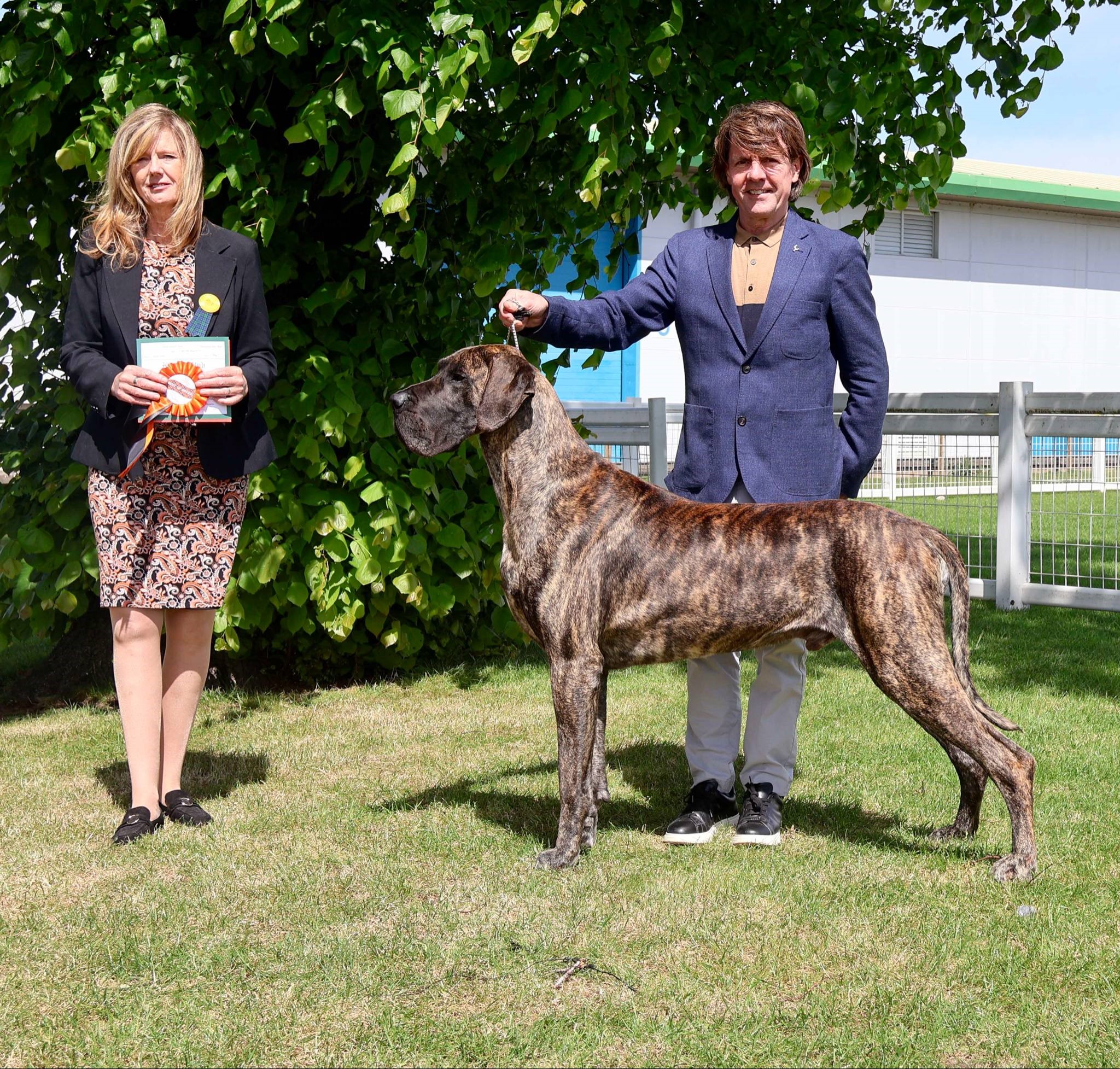 Littermates Guy and Lori were born in lockdown. Lesley and I could barely contain our excitement with these two youngsters who excited us greatly. So when June 2021 saw the return of the show scene we were delighted that they both took to the ring as if they had been there and done that all before. Guys record is impeccable and has achieved so much throughout the year culminating in his Top Great Dane award. He is a proven sire (very efficient), has frozen semen stored and we are very excited for the year ahead. He is a delight.