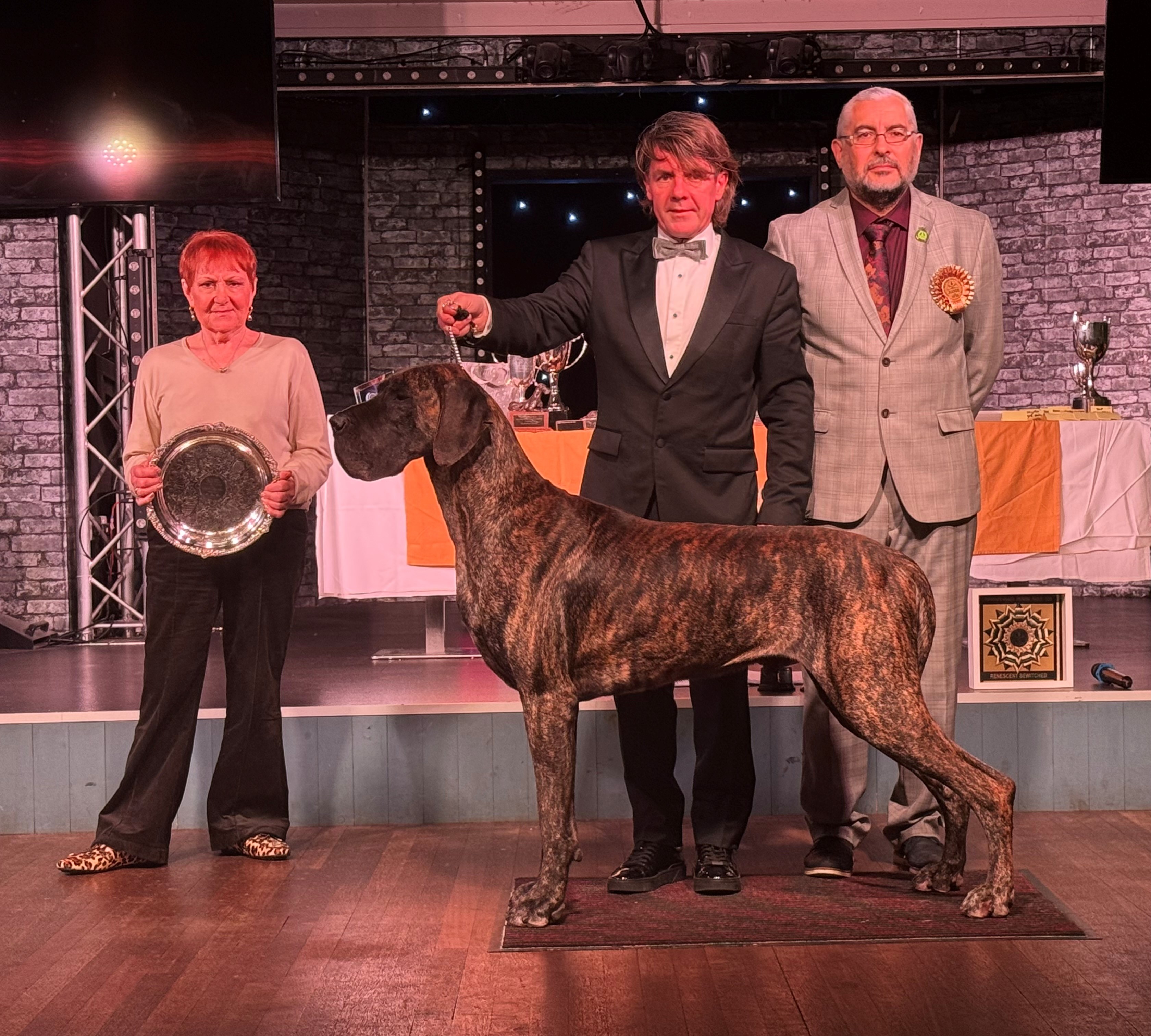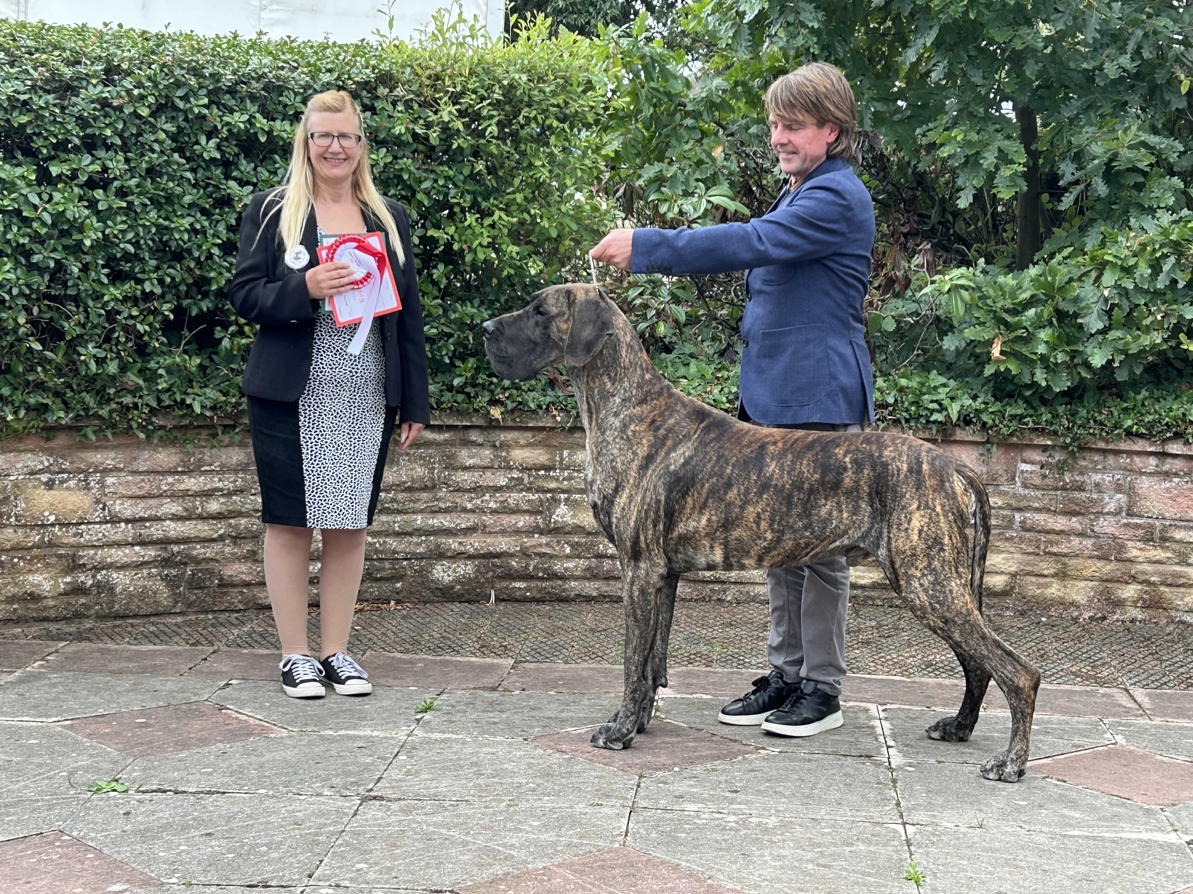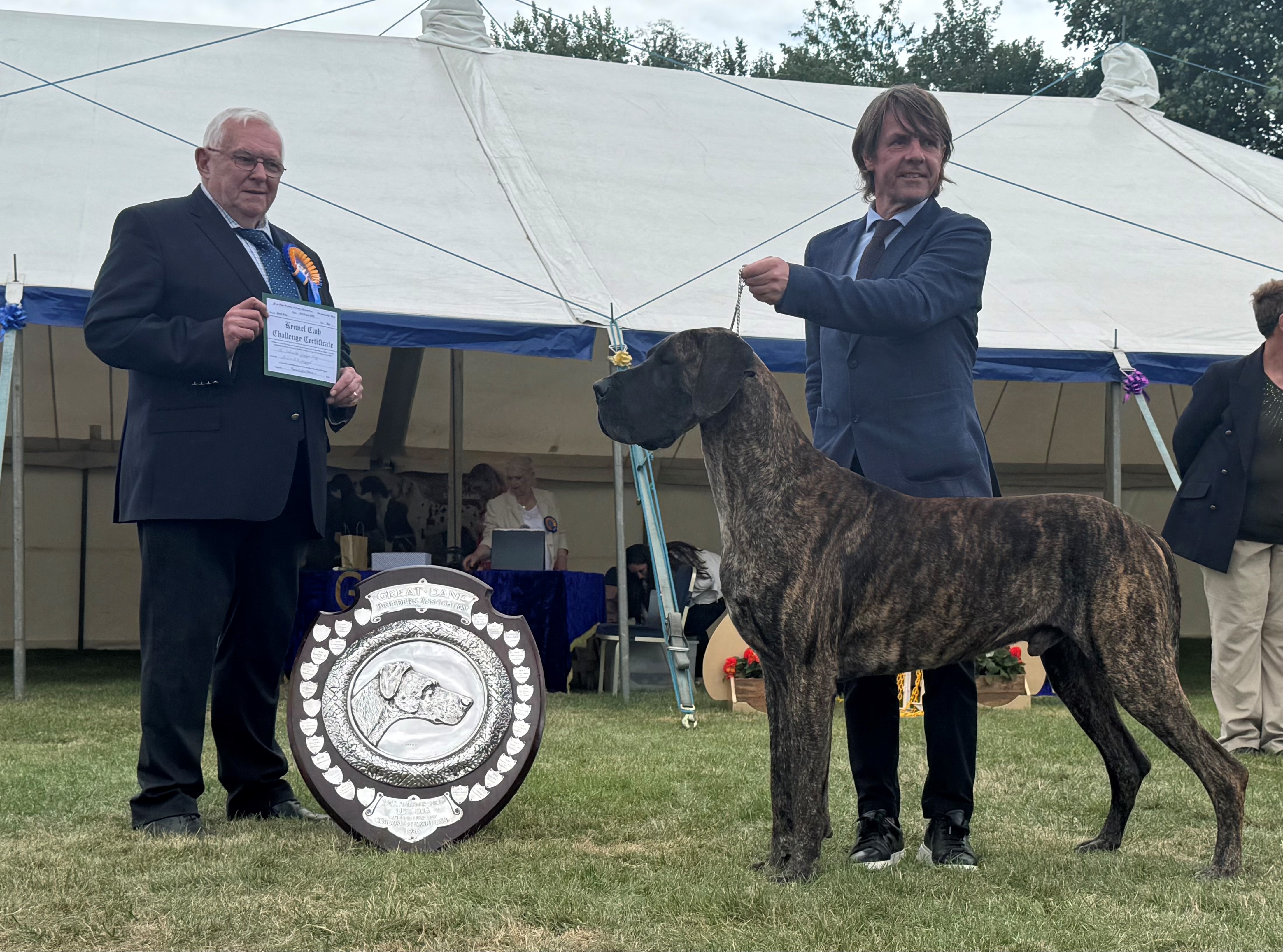 Littermates Guy and Lori were born in lockdown. Lesley and I could barely contain our excitement with these two youngsters who excited us greatly. So when June 2021 saw the return of the show scene we were delighted that they both took to the ring as if they had been there and done that all before. Guys record is impeccable and has achieved so much throughout the year culminating in his Top Great Dane award. He is a proven sire (very efficient), has frozen semen stored and we are very excited for the year ahead. He is a delight.