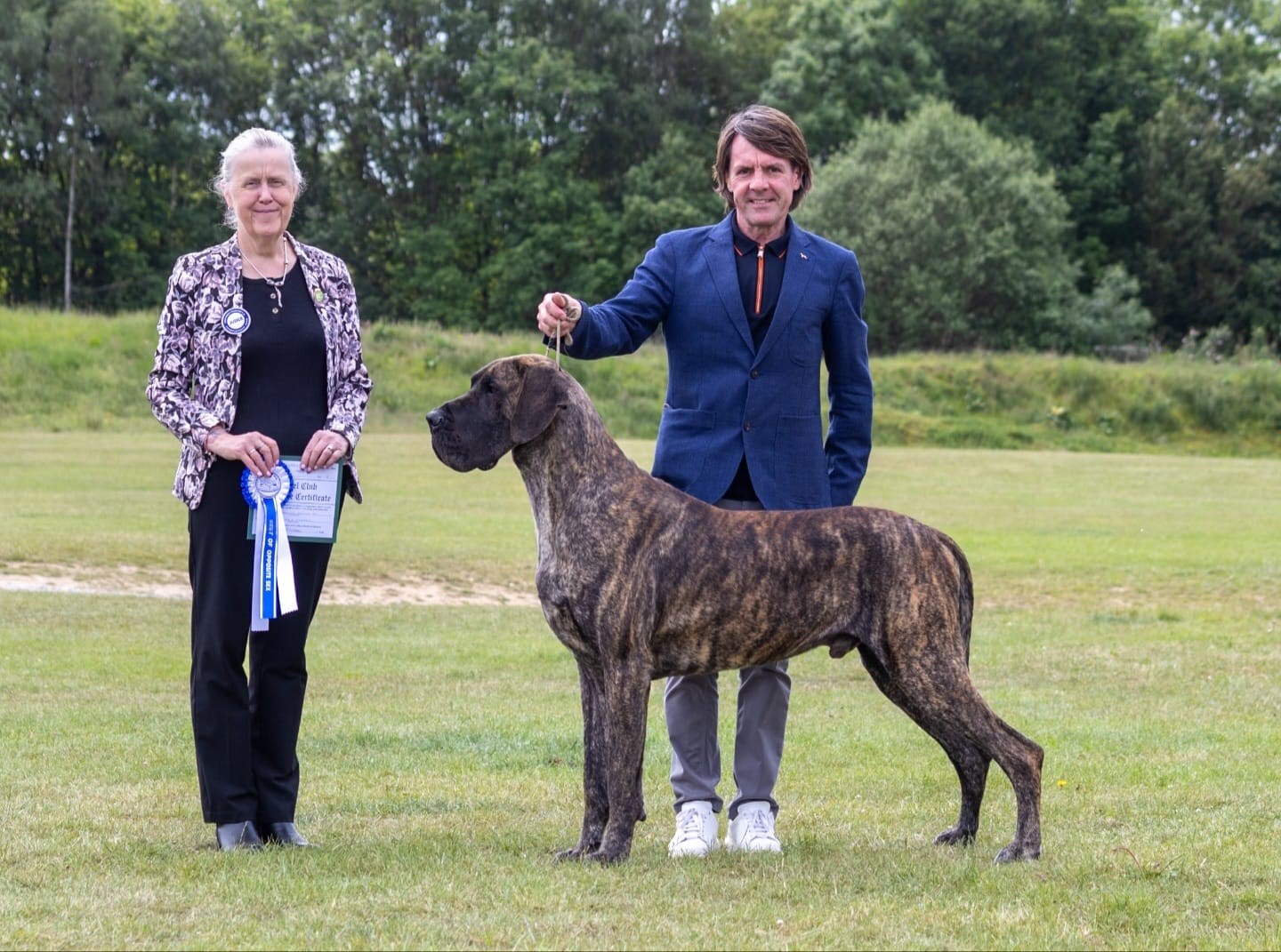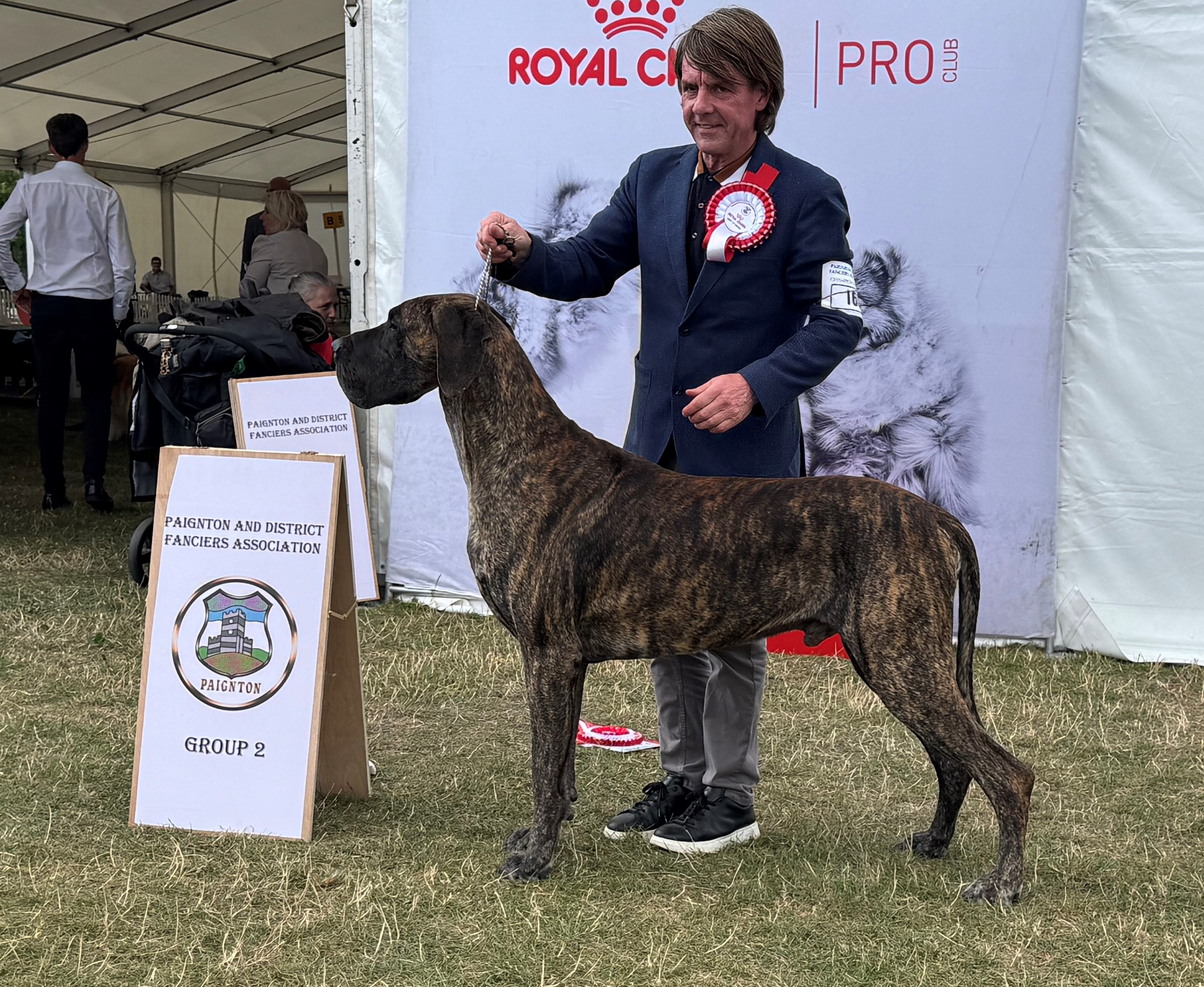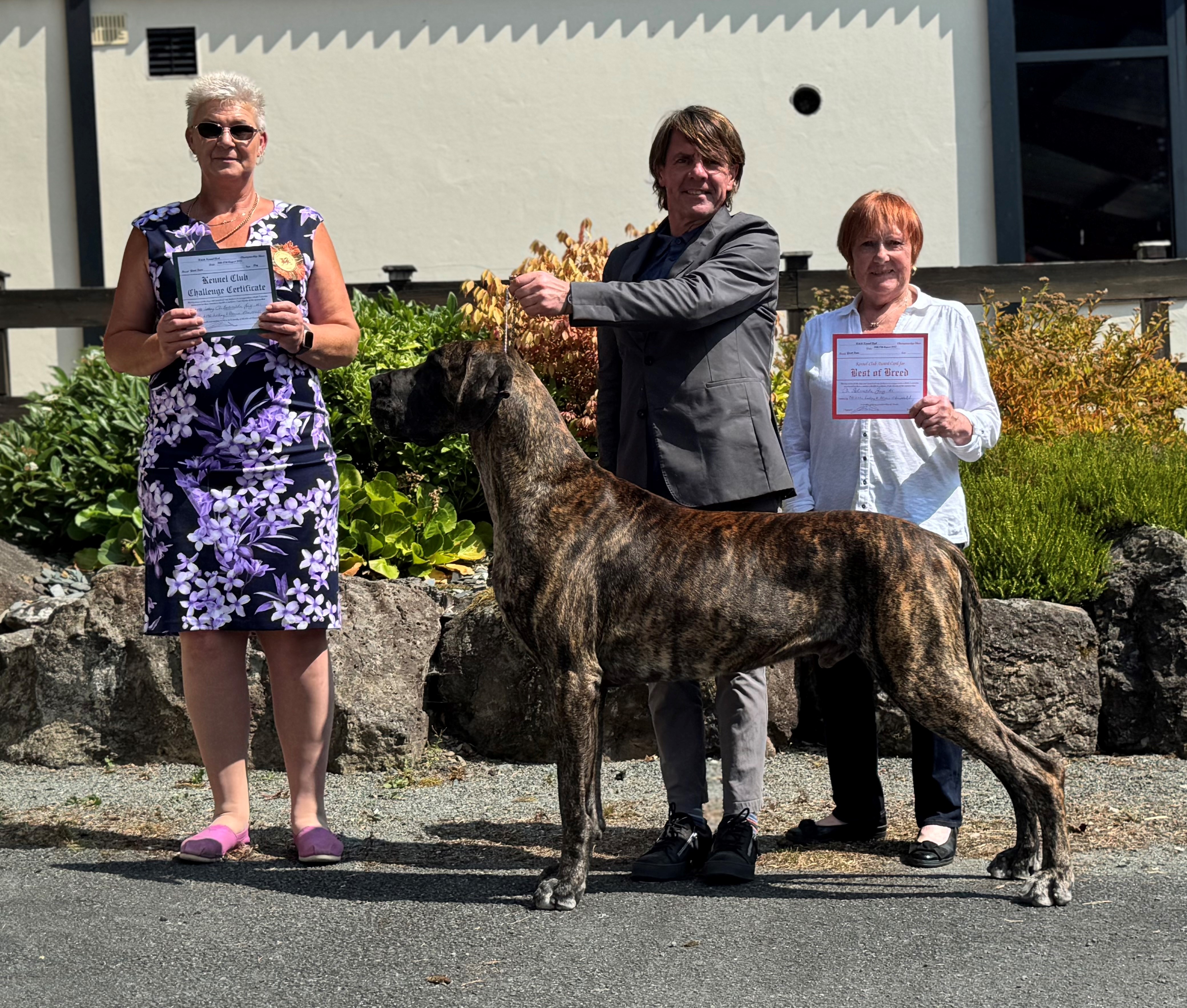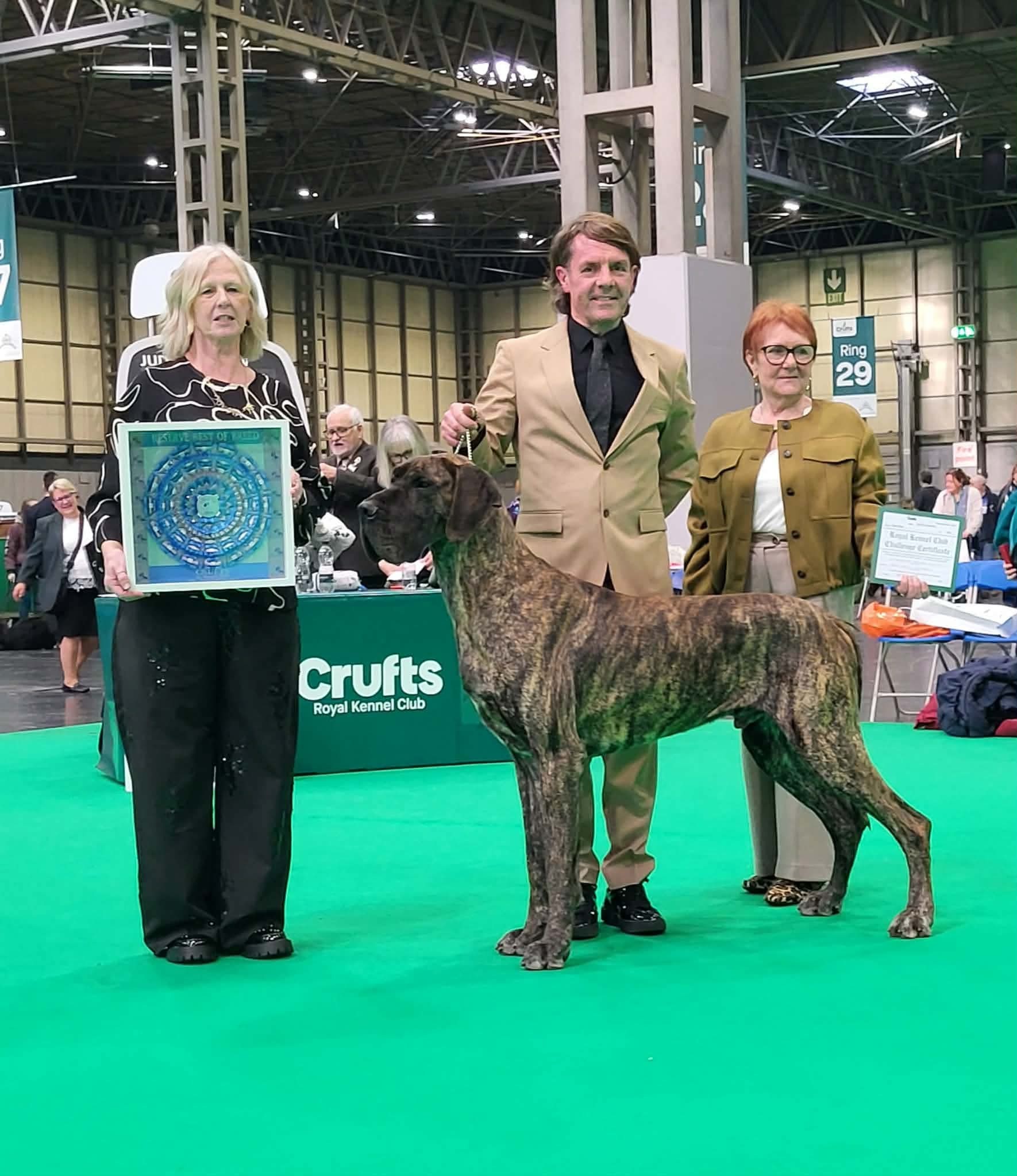 Littermates Guy and Lori were born in lockdown. Lesley and I could barely contain our excitement with these two youngsters who excited us greatly. So when June 2021 saw the return of the show scene we were delighted that they both took to the ring as if they had been there and done that all before. Guys record is impeccable and has achieved so much throughout the year culminating in his Top Great Dane award. He is a proven sire (very efficient), has frozen semen stored and we are very excited for the year ahead. He is a delight.