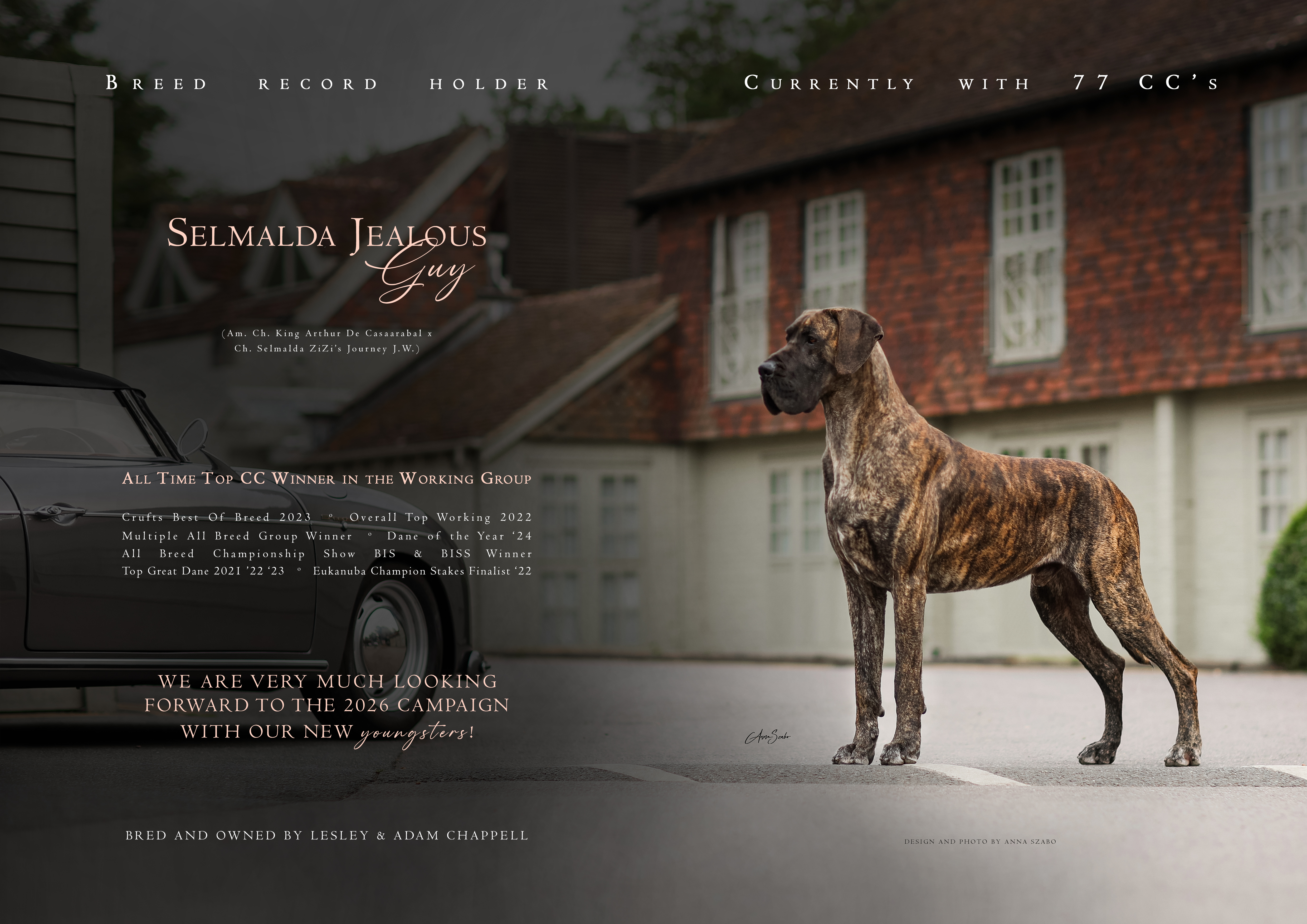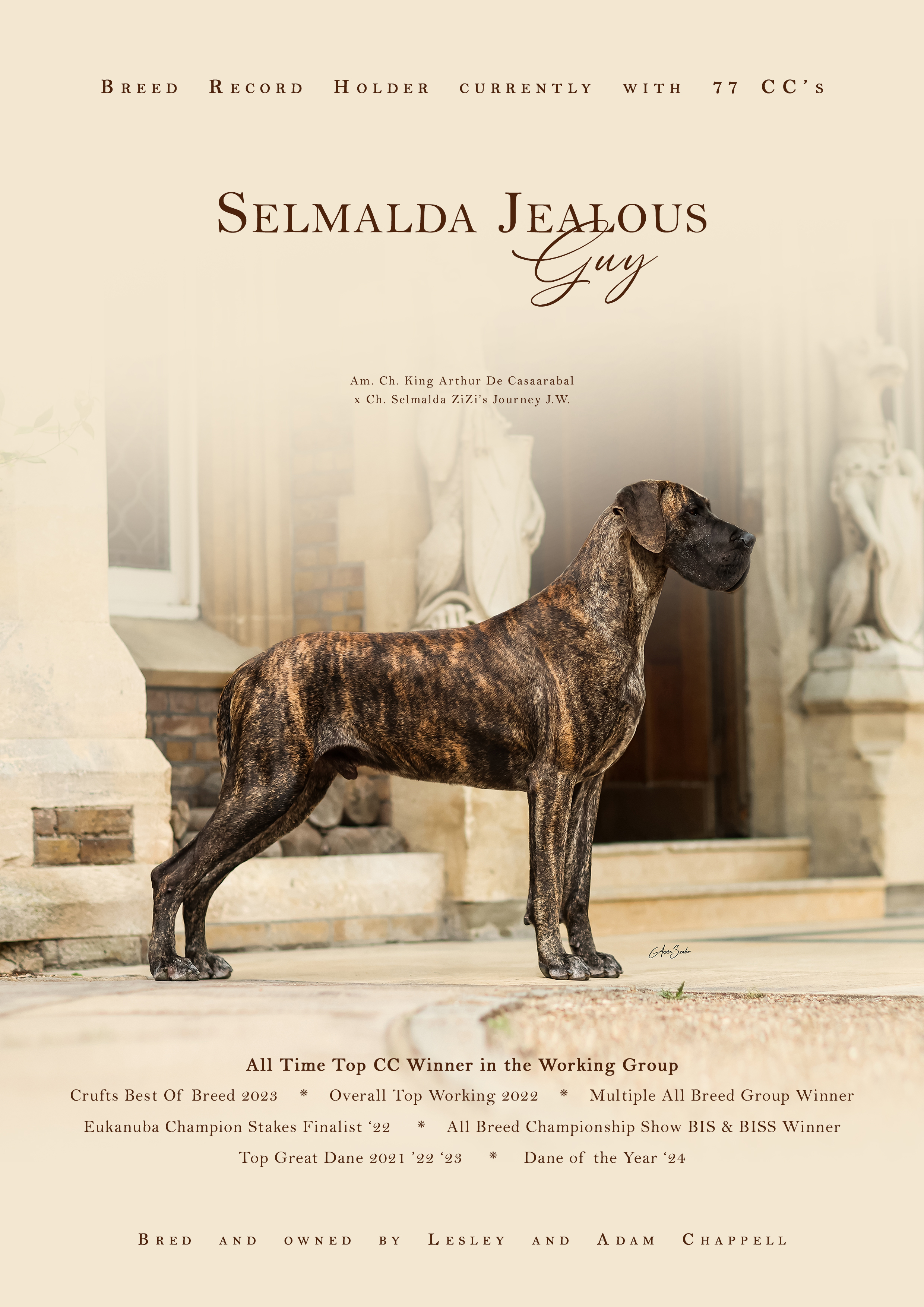 Crufts 2026! Ch. Selmalda Jealous Guy 1st Open Dog & DCC #80 (Jr. Cr. Ch. Am. Ch. King Arthur De Casaarabal x Ch. Selmalda ZiZi’s Journey J.W.) Lesley and I could not be prouder of Guy and all that he acheives. And proving his worth as a sire as his daughter, Ch. Indy wins BCC & BOB (& Group4!) for owner Mick Stanton and handled by Paula Chibeba! Thanks to Chris for the photo and of course Mandy Bithell for thinking so highly of our Danes and breeding! Delighted with judge Mandy Bithell's critique following Guy's Cruft's win - OD (13,3) 1 Chappell's Ch. Selmalda Jealous Guy (ai) I believe this was this record-breaking Brindle boys ‘80th’ CC! What a tremendous achievement & every bit deserving of that accolade. Shouts ‘All male Great Dane,’ standing firm, muscular & sound. Balanced & flowing throughout. I doubt there’s anything I can say or add, that hasn’t already been said before. He commands the ring with his striking outline & majestic, regal appearance. Rich in colour & superb muscular condition. Head of good proportions, with broad muzzle & square drop of lip. Would like to see him use his ears more, with ‘Dash & Dare’ which would set off the finishing touch. He fills his front with excellent depth & width, standing on firm legs & feet, with toenails clipped to perfection. This certainly helps the appearance of his tight, cat-like feet. Elbows tucked neatly under his nicely rounded spring of rib, giving off a flowing appearance, with the required ‘tuck-up.’ Strong arched neck, which flows into well angulated shoulders & excellent return of upper arm. Firm topline, with excellent croup & tail set. Well angulated hind quarters, well-muscled 2nd thigh & low set hocks which he knows how to drive from, as he powers round the ring. Correct footfall when viewed from all angles. His handler certainly knows how to get the best out of him. Both owning the large ring with presence & style. Shown in sound condition, with handler, perfectly suited to compliment his dog. I was pleased to award him the Dog CC. Did I mention, it was his 80th!? Just wow. Congratulations.